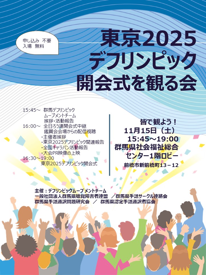東京2025デフリンピック開会式を観る会のお知らせ 2025/10/30 東京2025デフリンピック開会式が11月15日に行われます。群聴障連では、 東京で行われる(一財)全日本ろうあ連盟の活動内容の紹介と併せて開会式の実施状 況を県センターにて上映します。 日時:令和7年11月15日(土) 午後3時45分~午後7時終了予定 会場:県社会福祉総合センター1Fロビー 申し込み不要 どなたでも見ることができます。イスの数に限りがあります。